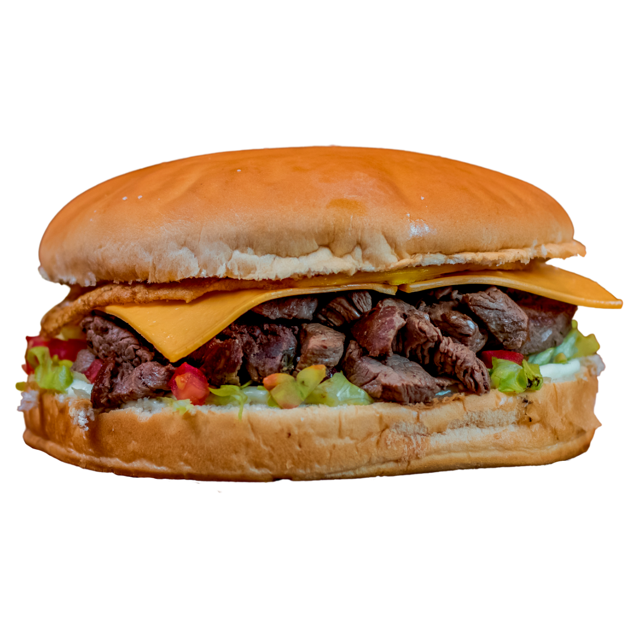 Maionese, Catchup, Mostarda, Milho, Ervilha, Tomate, Ovo, Queijo, Alface e iscas de filé ao alho e oléo