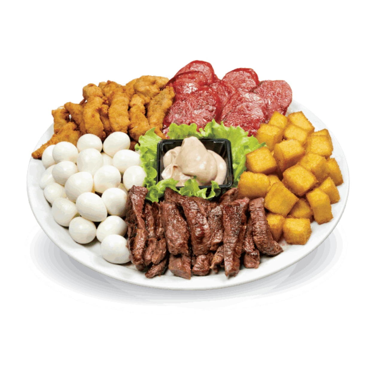 Alcatra, coração, frango, anéis de cebola, calabresa, fritas, ovos de codorna, pepinos, azeitonas, queijo